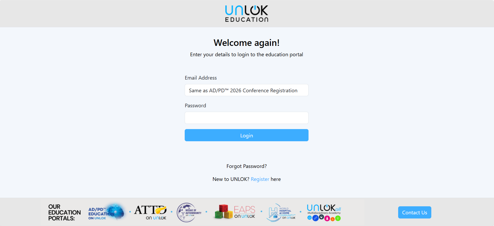 - The ‘Contact Us’ button on the AD/PD™ Education on UNLOK portal.